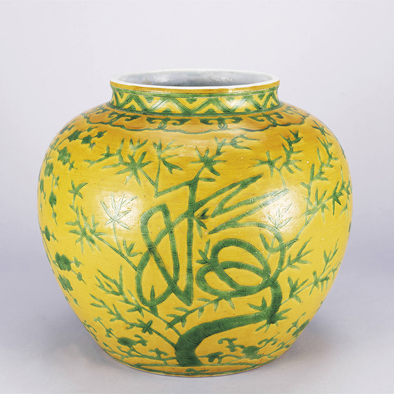 明嘉靖 黄地绿釉福寿禄花卉纹罐