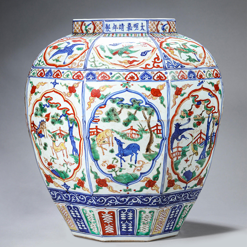 明嘉靖 五彩鹤鹿同春花卉纹大罐