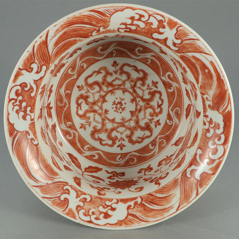 明永乐 矾红缠枝花卉海水纹折沿盆