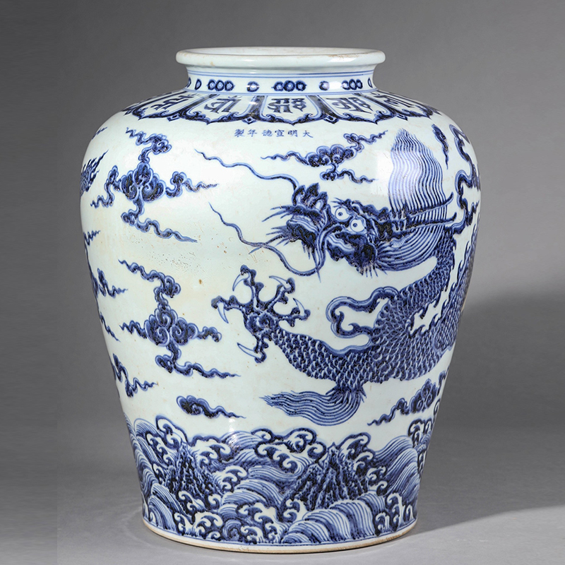 明宣德 青花梵文海水龙纹罐